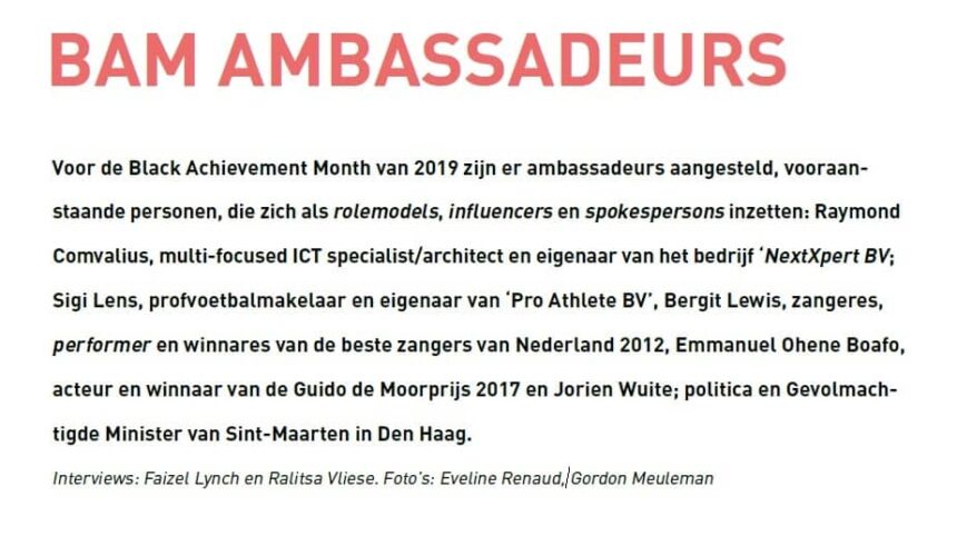 Dat is volgens Lens ook het grote belang van de Black Achievement Month. “Je kijkt naar voorbeelden waaraan je kunt spiegelen. Maar die voorbeelden hoeven niet groots te zijn. Soms zijn er mensen die veel voor hun buurt betekenen. Kinderen kijken tegen ze op en anderen kunnen zich hen aan optrekken. Die mensen vind ik de echte achievers.”