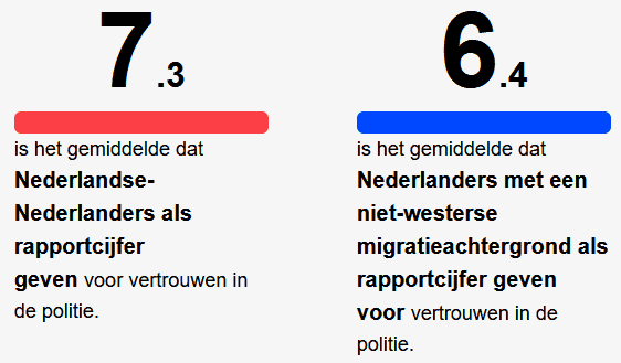 Uit de resultaten blijkt ook dat driekwart van de Amsterdammers met een niet-westerse migratieachtergrond een voldoende geeft als het gaat om hun vertrouwen in de politie tegenover 92% van de Nederlands-Nederlandse respondenten.