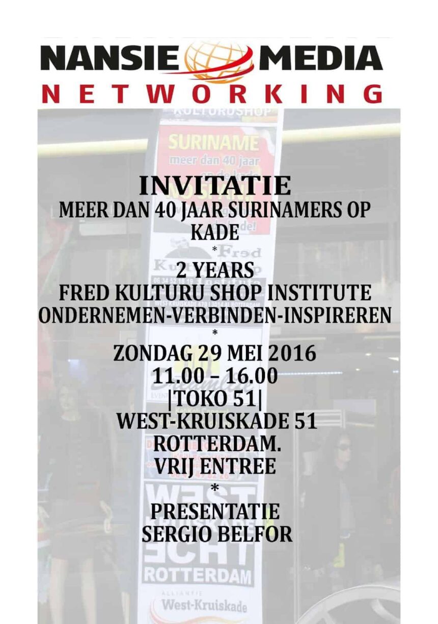 Het networking evenement dat wordt gehouden bij Toko 51 aan de West-Kruiskade 51, Rotterdam, is georganiseerd in verband met het tweejarig bestaan van Fred Kulturu Shop.