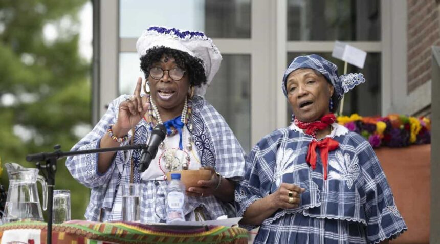 Denussa Frijde is afstammeling van de Marrons, die in de tijd van de slavernij de Surinaamse plantages ontvluchtten en in het binnenland hun eigen dorpen vormden. Haar overgrootvader Agbago Aboikoni was tot 1989 opperhoofd van de Saamaka, een van de Marrongemeenschappen in Suriname. Frijde brengt samen met haar oom Sylvester Aboikoni het plengoffer.