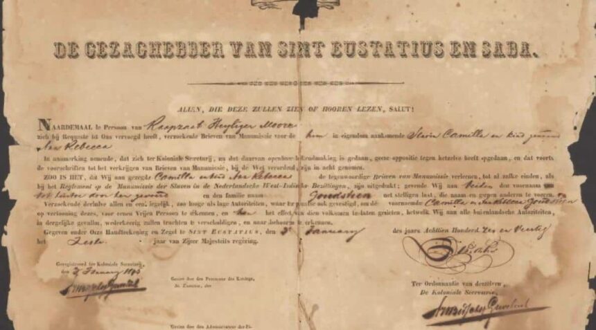 Foto: akte van manumissie van Camilla Goudsteen en haar dochter Ann Rebecca op 3 januari 1848 door Raapzaat Heyliger Moore, de laatste slavenhouder van de plantage Golden Rock, St. Eustatius.