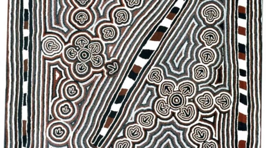 Illustratie: De afbeelding is van Biddy Long Nungarrayi (1932-); Bush Turkey Dreaming; Australië; ca. 2005; acryl op canvas; 7106-504. Plaatsbepalingen kun je op veel manieren in kaart brengen. Dit schilderij toont een ‘Dreaming’ van de Warlpiri mensen uit de Northern Territory. Hierop zingen en dansen de vrouwen als deel van een ceremonie over de boskalkoen wanneer die van waterpoel naar waterpoel reist om zich te voeden. De cirkels staan voor bestaande waterpoelen
