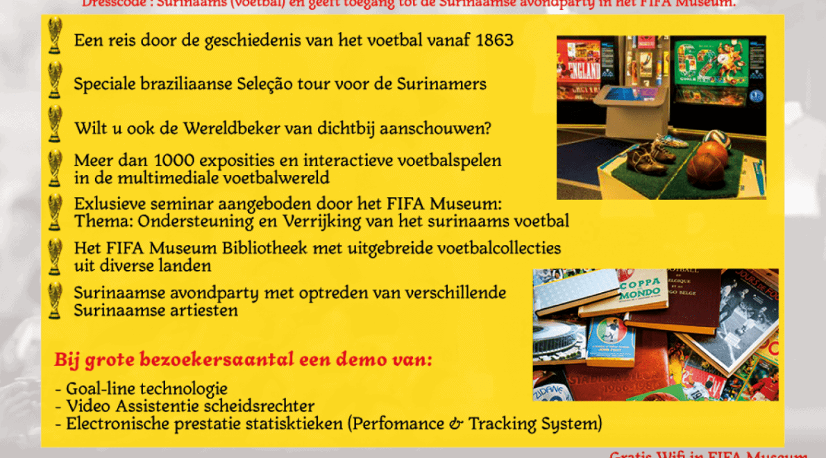 Daarnaast willen wij met deze activiteit in het FIFA Museum de Surinaamse bijdrage aan het mondiaal voetbal met u delen.